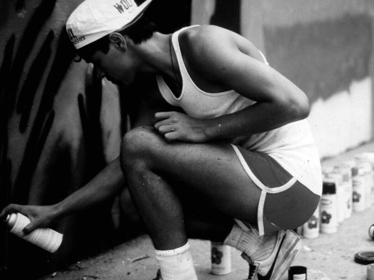 In 1982, he painted two monumental murals in a handball court then nicknamed “Rock Steady Park”. The first was called “Sky’s the Limit” in reference to the lyrics of the song “Keep On” by the band D-train. The work depicted several iconic NYC landmarks and served as a poignant illustration of the song’s lyrics. The second mural was called “Eye of the Tiger”. Today, the murals have long since disappeared. The small field between Amsterdam Avenue and West 99th Street that was once home to the B-boy legends of the Rock Steady Crew has been rehabilitated and the handball court no longer exists.
